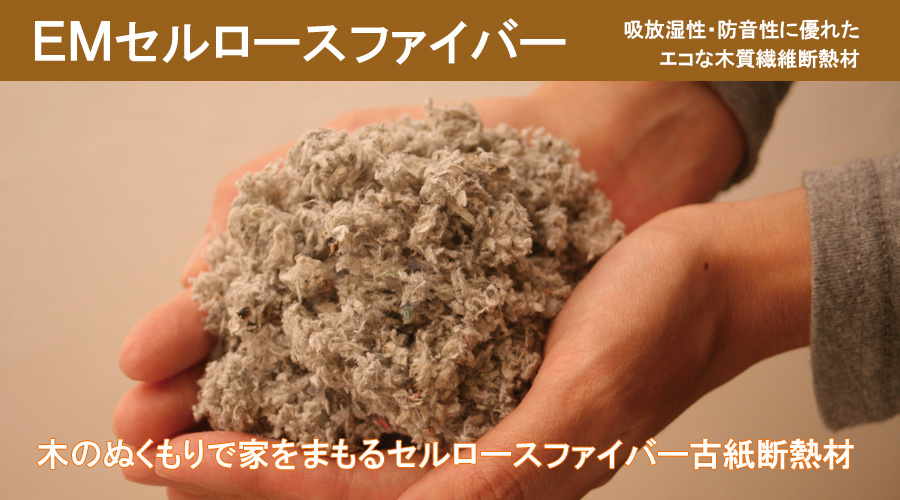 EMセルロースファイバーは、回収した新聞古紙を粉砕して自社で製造されたエコロジーな木質繊維の断熱材です。外国からの輸入材に頼るのではなく、地元の不要な新聞紙を集め、地域の家の再生に活かしています。